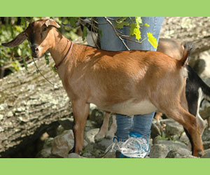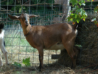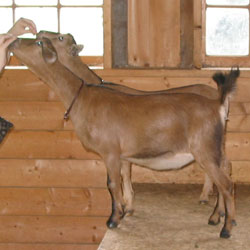 Allegra has the same sire as Seraphina making them half sisters. They tend to sleep and feed near each other. Allegra shows her Nubian heritage in her ears and shape of her head. She is a tall girl who has recently shown marked growth in all directions. Her depth of body, width and length have suddenly all increased. Her heart girth has increased enough to move her past the leggy teenager look. She has a strong and willing personality and is ready to run, jump and battle for food or just for the fun of it. She's always ready for some attention.