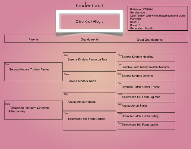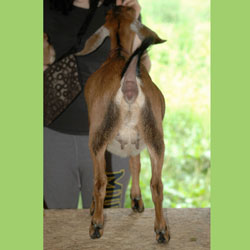 Her sire Fantin tends to play a strong role in the conformation of all his kids so I expect Allegra to grow into a good example of a dual purpose goat with thickness and milk production. Her dam has small teats but Allegra seems to have larger sized teats so I don't expect that to be an issue. Her dam Cinnamon has the lovely triangular shape of dairy along with the meatiness necessary to fulfill the Kinder breed dual purposes of meat and milk. She passes down to her offspring a nice topline including fairly level rump. I expect Allegra to surpass her dam in a number of ways and for Allegra's offspring to be fine examples of the Kinder goat.