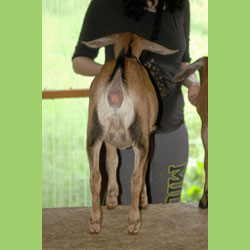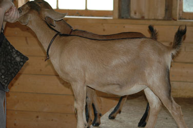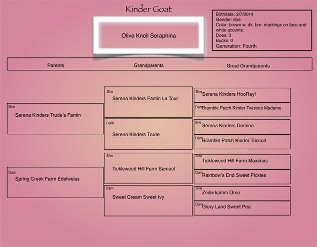 Her sire Serena Kinders Trude's Fantin is a very solid, well-blended buck with lots of width, length and depth of body. He is a good choice to bring the thickness to embody the meat end of the dual purpose spectrum. I expect Seraphina to be a solid and stocky doe with an easy to milk udder. I look forward to what she'll pass on to her kids.