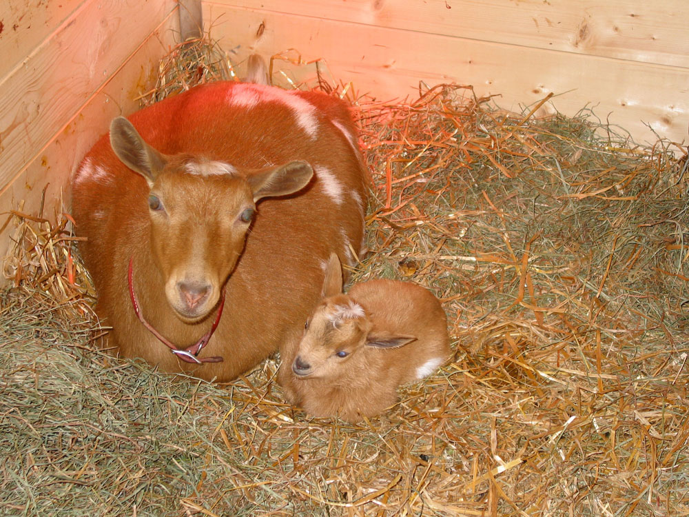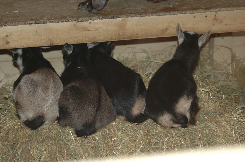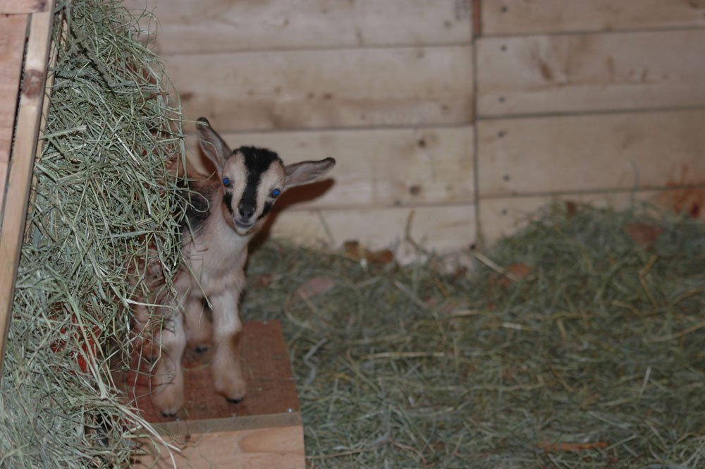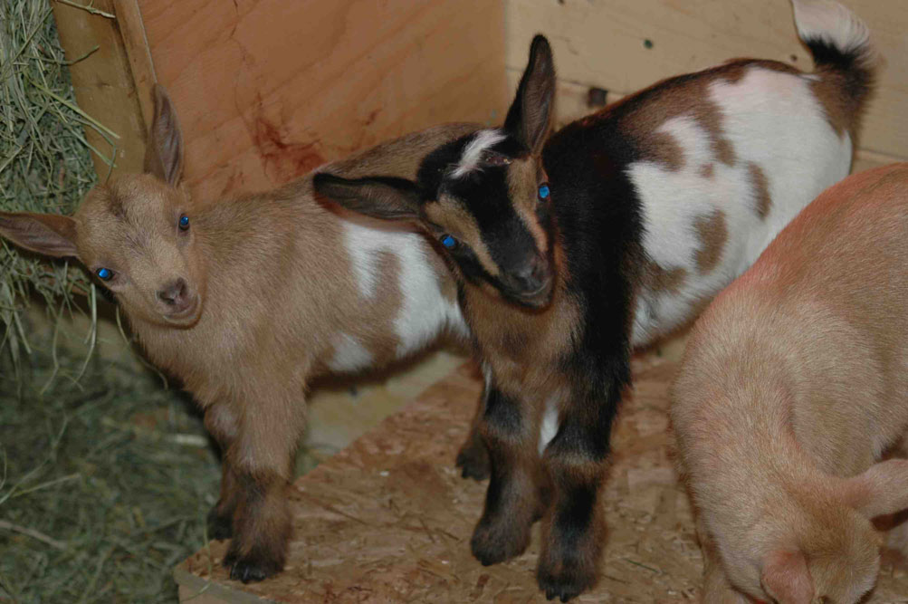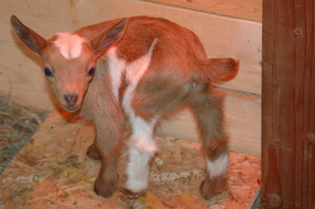 We disbud all the goats born here to avoid accidental injuries and so that they can be shown by any future owner. We give the dams CDT vaccination toward the end of pregnancy to provide some protection to the kids but we do not do any other routine vaccinations. We provide free-choice minerals of various types and feed the best quality hay we can buy.
