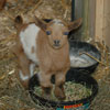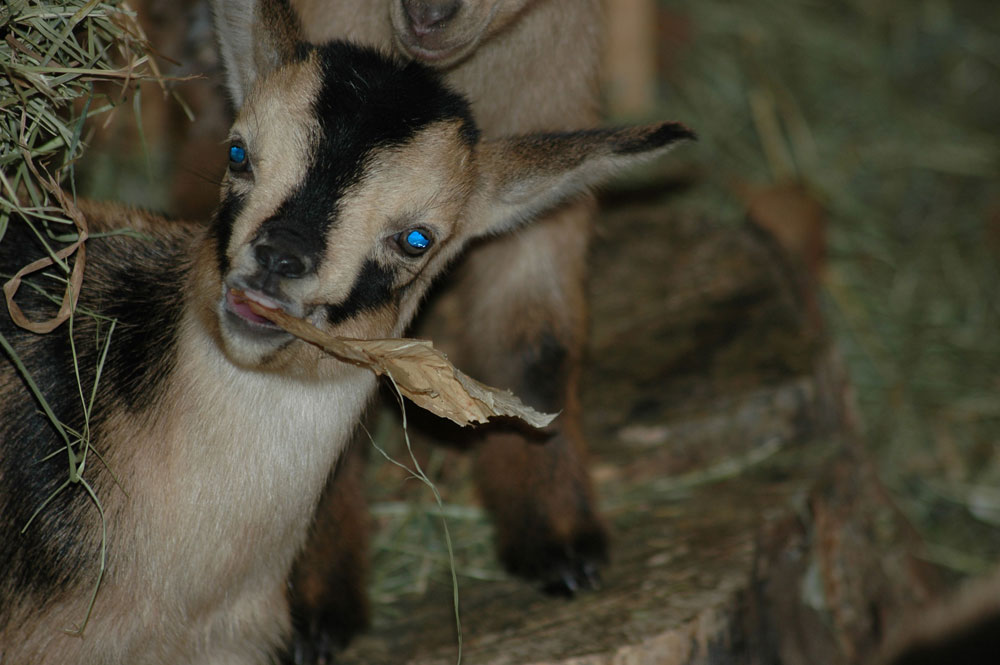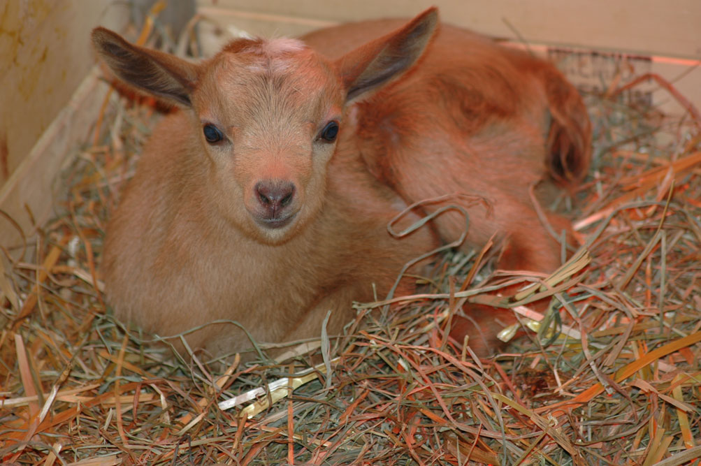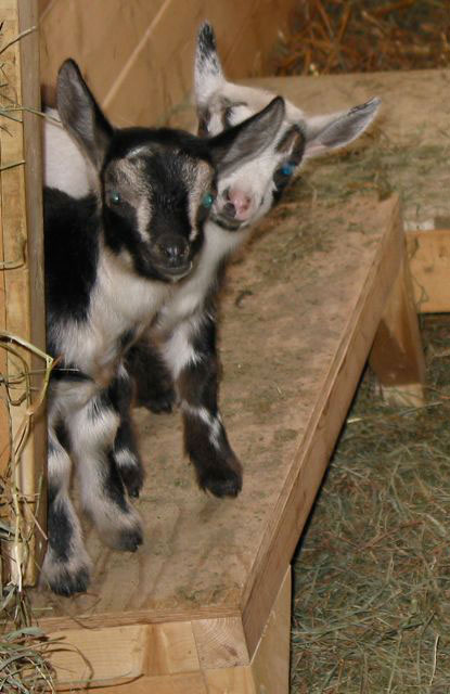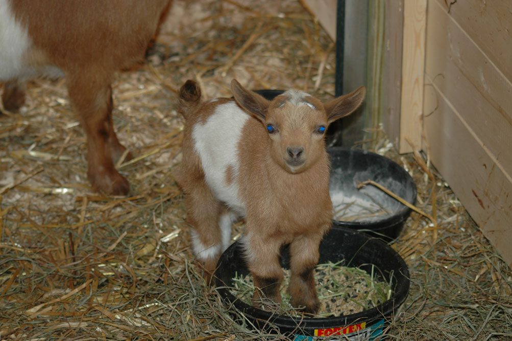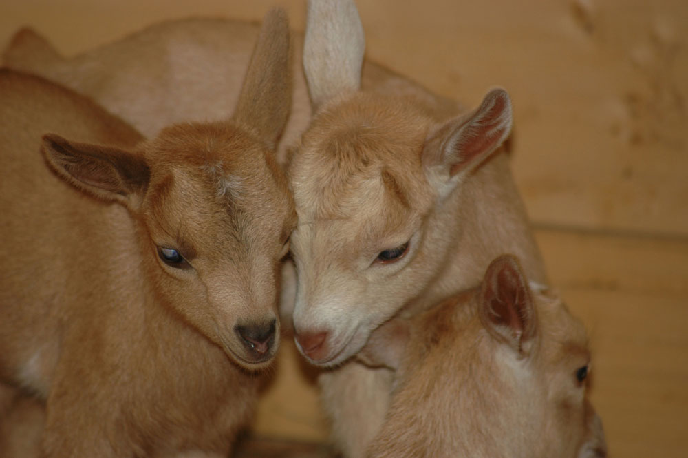 We disbud all the goats born here to avoid accidental injuries and so that they can be shown by any future owner. We give the dams CDT vaccination toward the end of pregnancy to provide some protection to the kids but we do not do any other routine vaccinations. We provide free-choice minerals of various types and feed the best quality hay we can buy.