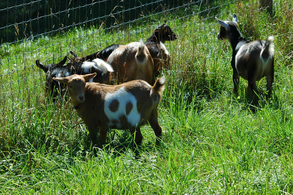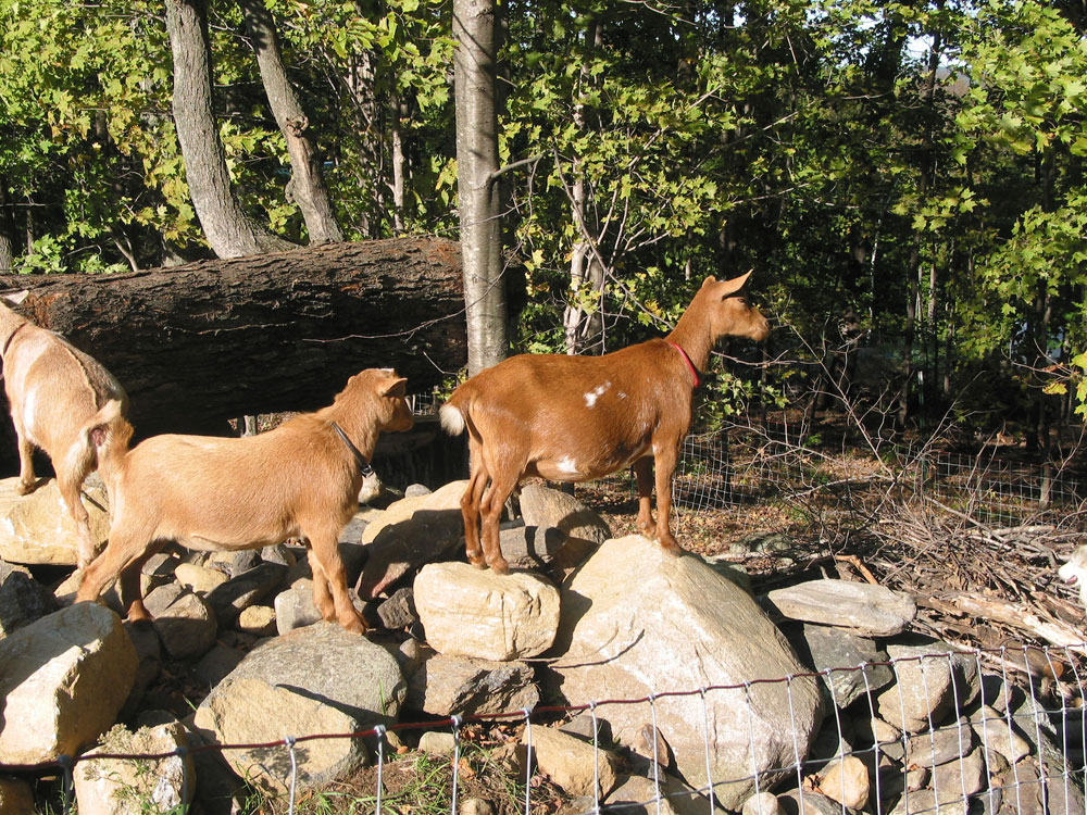 We delight in the livestock we raise here and we're working to provide the best diet and management options possible to maintain a high level of health and happiness in our herd. We avoid genetically engineered feed and use natural methods as much as possible. We're committed to raising food in ways that are respectful to the plants and animals in our care. Our goats are loved and given access to pastures, stone walls for climbing, and platforms for sleeping and acrobatics. They are all friendly and people-loving. When we walk into the stalls or pasture they come over for attention.